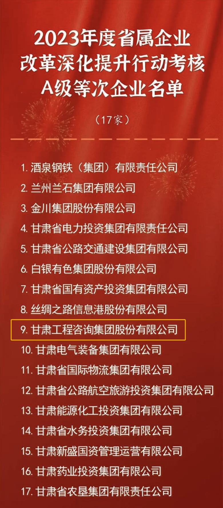 根據《2023年全省國企改革深化提升行動考核評估工作方案》,2023年度省屬企業改革深化提升行動考核結果已經省政府國資委主任辦公會審議通過。A級等次企業名單如下: