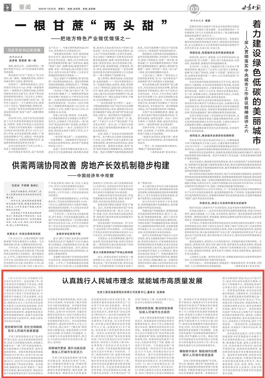7月14日至15日,中央城市工作會(huì)議在北京舉行。這是時(shí)隔十年,黨中央再次召開(kāi)的城市工作會(huì)議,為新時(shí)代新征程城市工作指明方向。甘肅工程咨詢集團(tuán)深入學(xué)習(xí)貫徹習(xí)近平總書(shū)記關(guān)于城市工作的重要論述,全面落實(shí)中央城市工作會(huì)議精神,認(rèn)真踐行人民城市理念,立足區(qū)域發(fā)展實(shí)際,將集團(tuán)公司七十余年技術(shù)積淀轉(zhuǎn)化為服務(wù)人民需求的實(shí)踐動(dòng)能,在優(yōu)化城市空間格局、提升城市功能品質(zhì)、推動(dòng)綠色低碳轉(zhuǎn)型、賦能智慧高效治理等領(lǐng)域精耕細(xì)作,助推全省城市建設(shè)向著高度與溫度并存、發(fā)展與惠民同步的方向邁進(jìn)。