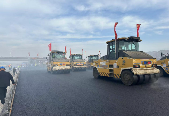 田間的風(fēng)醇厚柔潤(rùn),壓路機(jī)上隨風(fēng)飄搖的旗幟迸發(fā)出一陣陣吶喊聲,為道路瀝青中面層鋪筑加油助威。