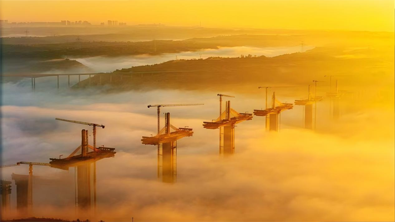 晨光初現(xiàn),建設(shè)中的橋梁在薄霧中若隱若現(xiàn),跨越河流、連接兩岸,為隴東大地經(jīng)濟(jì)騰飛插上翅膀。