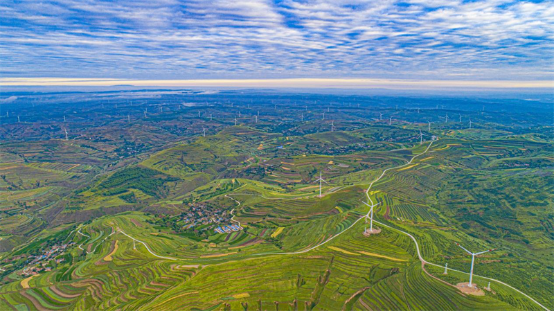 梯田蜿蜒起伏,村莊錯(cuò)落有致,云海連綿不絕,風(fēng)車(chē)悠然旋轉(zhuǎn),織就了人與自然和諧共生的美麗畫(huà)卷。