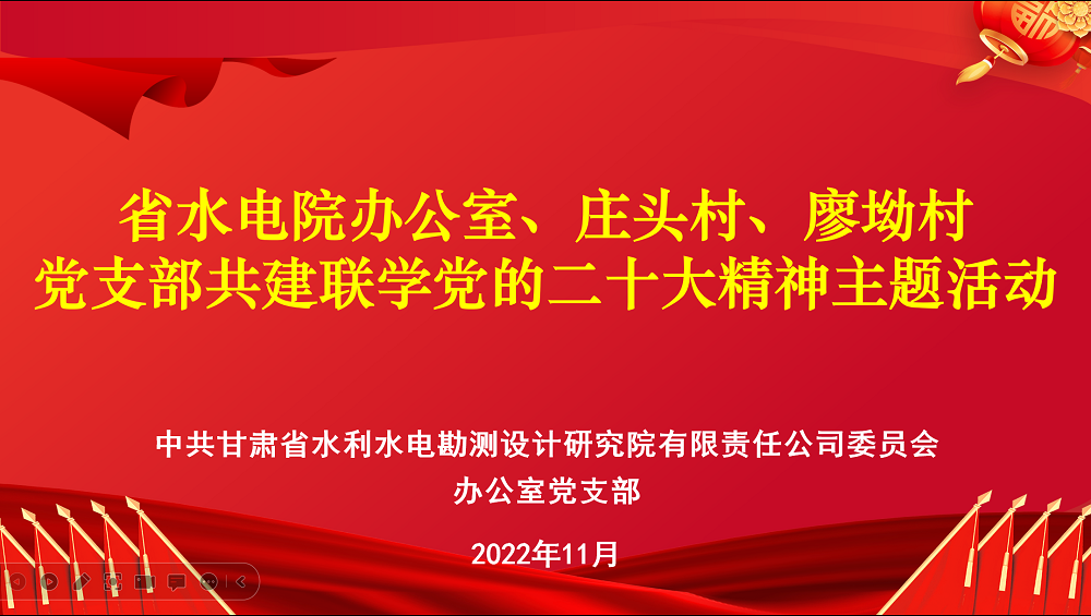 為持續促進黨的二十大精神學習貫徹走深走實,使黨的二十大精神進村入戶、深入人心,11月22日,甘肅省水利水電勘測設計研究院有限責任公司辦公室黨支部與幫扶村西峰區莊頭村黨支部、廖坳村黨支部開展共建聯學黨的二十大精神主題活動。