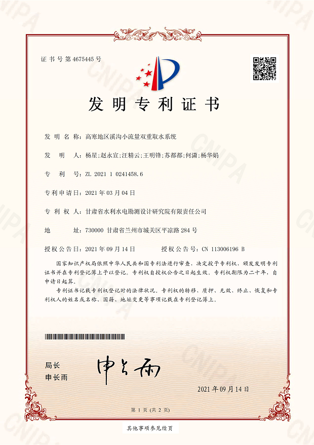 發(fā)明專利證書—高寒地區(qū)溪溝小流量雙重取水系統(tǒng)